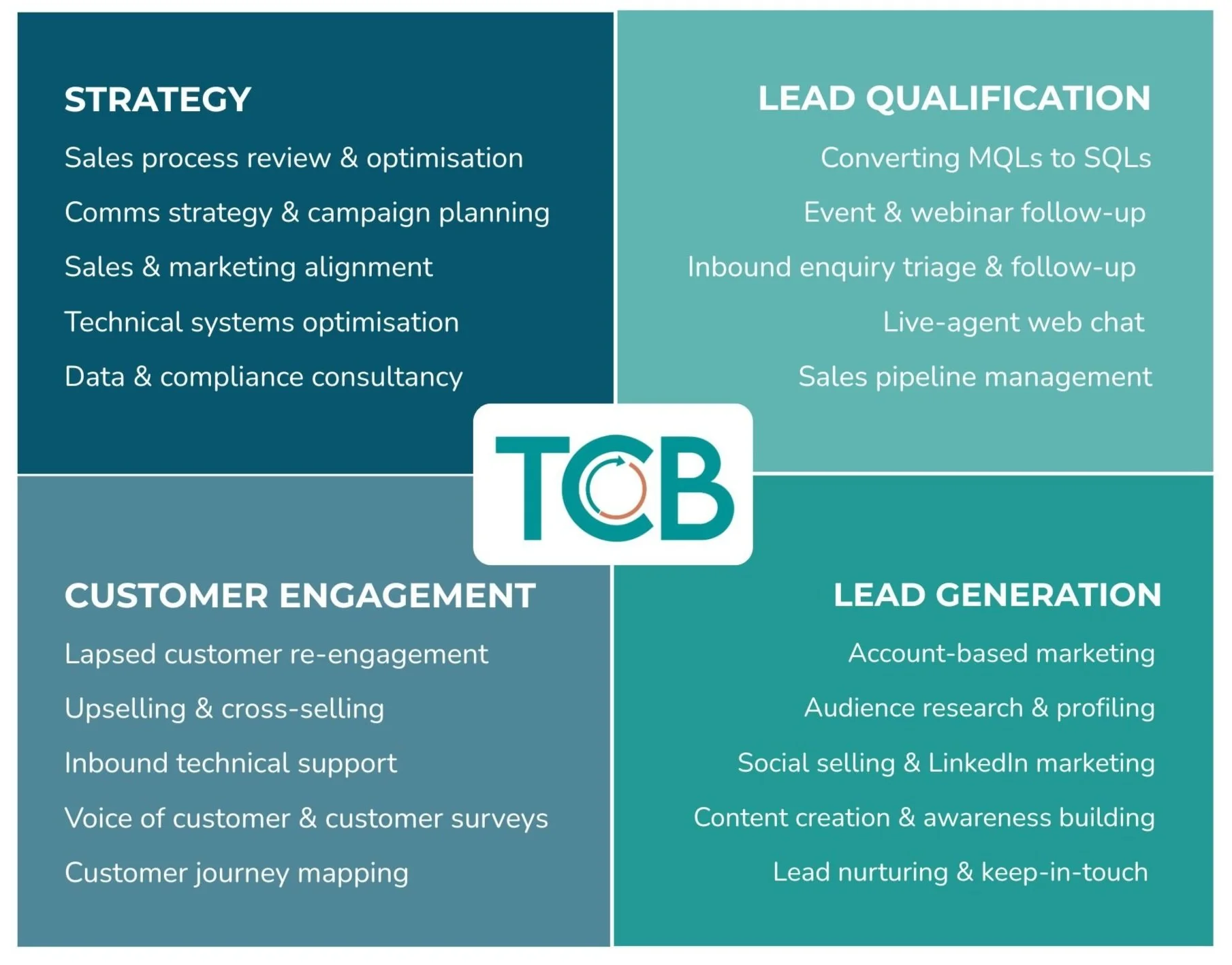 At TCB, we deliver intelligent, multilingual business development solutions that combine strategic insight with human connection. Our services span the entire buyer journey - from lead qualification and pipeline nurturing to customer engagement, ABM, and sales strategy.